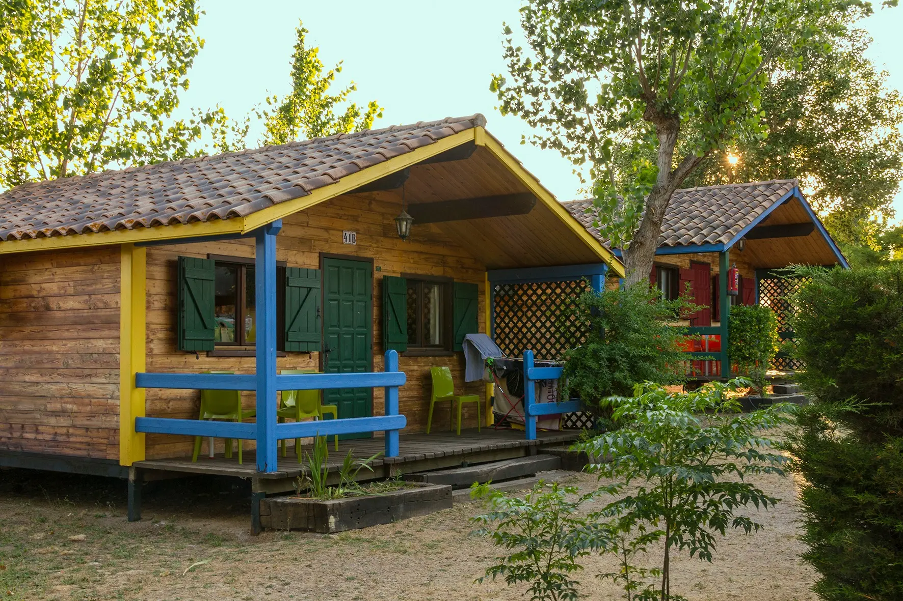 Bungalows en Madrid de aspecto exterior rústico, alegres, coloridos y de variados diseños. Muchos de nuestros alojamientos han sido personalizados con reproducciones de Miró o Van Gogh.